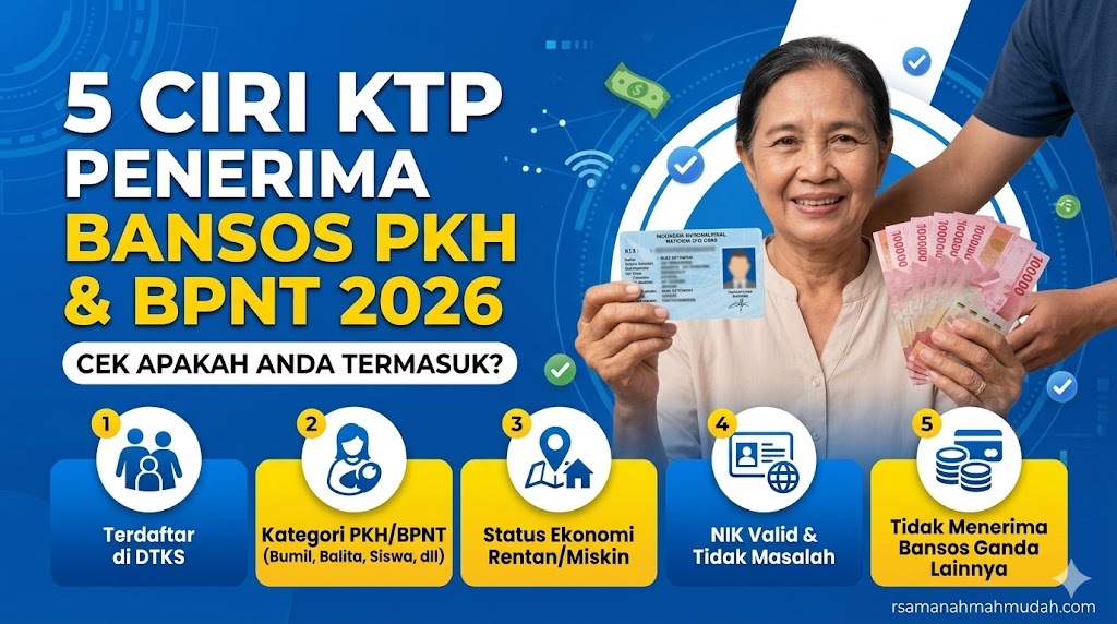 Mengetahui ciri-ciri KTP penerima bansos PKH dan BPNT 2026 sangat penting agar masyarakat yang berhak bisa segera mengecek dan mengakses haknya. Lima ciri utama meliputi terdaftar di DTKS desil 1-4, memiliki komponen PKH, alamat sesuai domisili, tidak punya aset berharga, dan NIK valid di Dukcapil. Pengecekan bisa dilakukan mandiri lewat aplikasi Cek Bansos, website DTKS, SMS, atau datang langsung ke kelurahan.